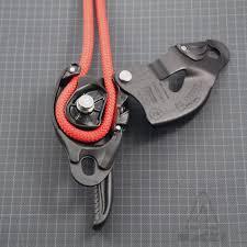 équipé d’un ergot de friction rétractable permettant de créer un frottement supplémentaire sur la corde, lors de la descente, sans avoir à ajouter de connecteur en plus ;